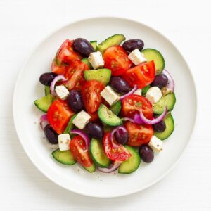 1 spieß (Klab; Lamm) salat, mit Pommes oder Reis